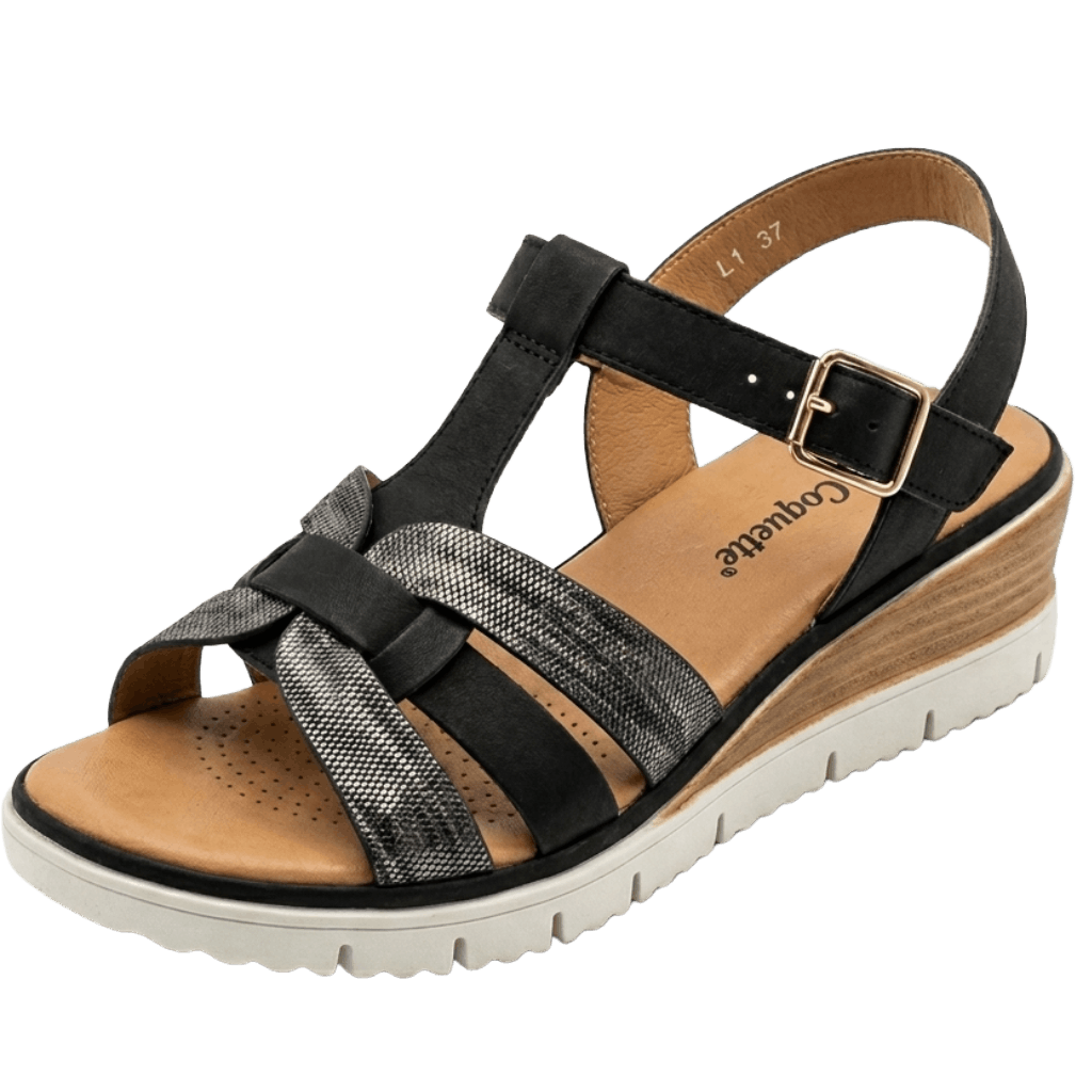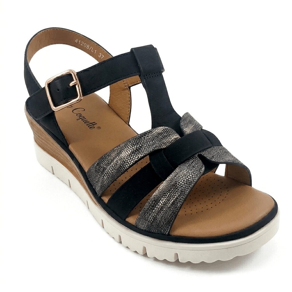 Οι γυναικείες πλατφόρμες La Coquette 45308-L1 σε κλασικό μαύρο χρώμα αποτελούν τη βάση για κάθε κομψή καλοκαιρινή εμφάνιση. Η La Coquette δημιούργησε ένα πέδιλο που συνδυάζει την ανατομική άνεση με την πολυτέλεια, καθώς διαθέτει έναν εξαιρετικά μαλακό και διάτρητο πάτο. Ειδικότερα, ο σχεδιασμός με τα χιαστί λουράκια στο μπροστινό μέρος αγκαλιάζει σταθερά το κουντεπιέ. Επιπλέον, οι μεταλλικές λεπτομέρειες σε gunmetal/μαύρο χρώμα προσδίδουν έναν σύγχρονο και εκλεπτυσμένο χαρακτήρα. Παράλληλα, το ρυθμιζόμενο λουράκι με τοκά στον αστράγαλο εξασφαλίζει την τέλεια εφαρμογή σε κάθε πέλμα. Συνεπώς, αποκτάτε ένα παπούτσι που προσφέρει την απαραίτητη υποστήριξη για όλη τη διάρκεια της ημέρας.
